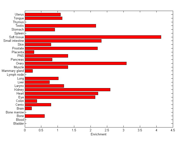 The expression level is normalized with tissue-library size. Each value for a gene in a tissue is a ratio of observed ESTs to the expected one in this tissue. The expected number of ESTs is the product of total ESTs of the gene and the fraction of total ESTs in the tissue among all ESTs in 30 tissues.