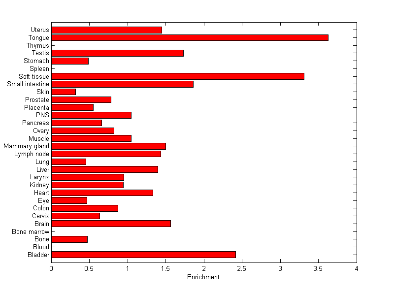 The expression level is normalized with tissue-library size. Each value for a gene in a tissue is a ratio of observed ESTs to the expected one in this tissue. The expected number of ESTs is the product of total ESTs of the gene and the fraction of total ESTs in the tissue among all ESTs in 30 tissues.