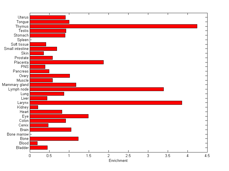 The expression level is normalized with tissue-library size. Each value for a gene in a tissue is a ratio of observed ESTs to the expected one in this tissue. The expected number of ESTs is the product of total ESTs of the gene and the fraction of total ESTs in the tissue among all ESTs in 30 tissues.