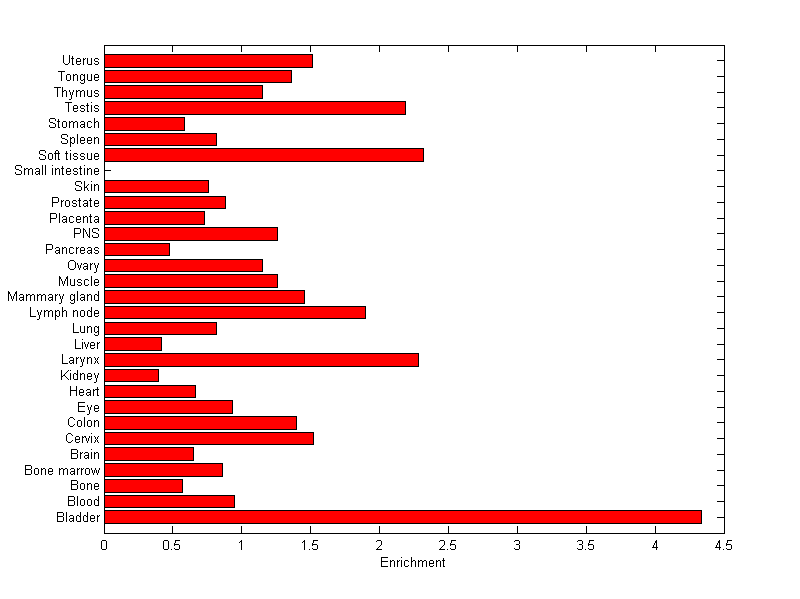 The expression level is normalized with tissue-library size. Each value for a gene in a tissue is a ratio of observed ESTs to the expected one in this tissue. The expected number of ESTs is the product of total ESTs of the gene and the fraction of total ESTs in the tissue among all ESTs in 30 tissues.