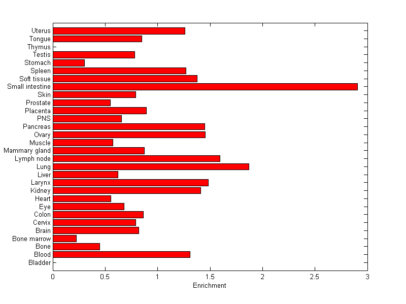 The expression level is normalized with tissue-library size. Each value for a gene in a tissue is a ratio of observed ESTs to the expected one in this tissue. The expected number of ESTs is the product of total ESTs of the gene and the fraction of total ESTs in the tissue among all ESTs in 30 tissues.
