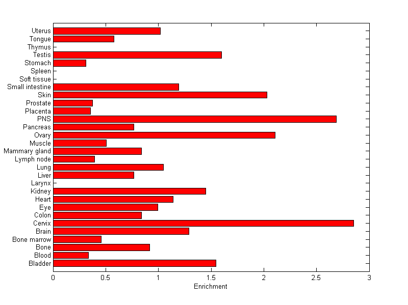 The expression level is normalized with tissue-library size. Each value for a gene in a tissue is a ratio of observed ESTs to the expected one in this tissue. The expected number of ESTs is the product of total ESTs of the gene and the fraction of total ESTs in the tissue among all ESTs in 30 tissues.