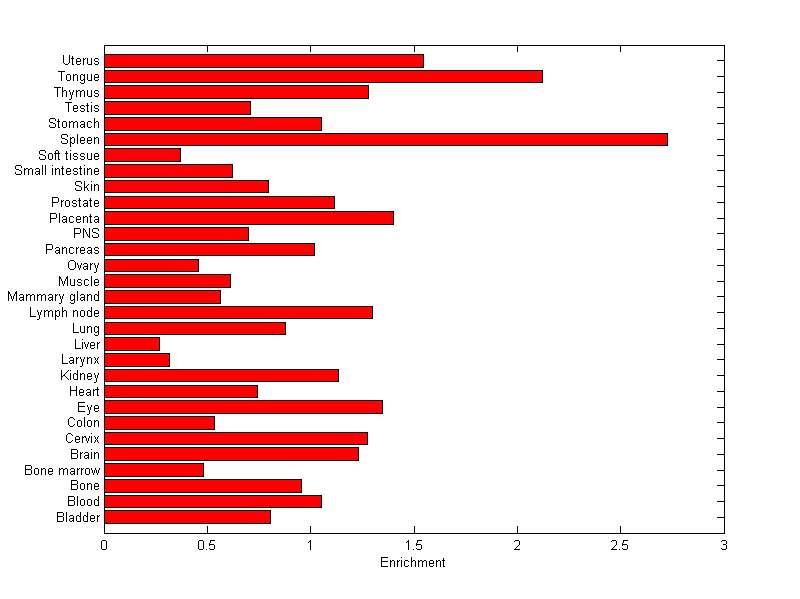 The expression level is normalized with tissue-library size. Each value for a gene in a tissue is a ratio of observed ESTs to the expected one in this tissue. The expected number of ESTs is the product of total ESTs of the gene and the fraction of total ESTs in the tissue among all ESTs in 30 tissues.