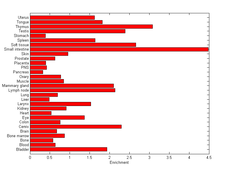 The expression level is normalized with tissue-library size. Each value for a gene in a tissue is a ratio of observed ESTs to the expected one in this tissue. The expected number of ESTs is the product of total ESTs of the gene and the fraction of total ESTs in the tissue among all ESTs in 30 tissues.