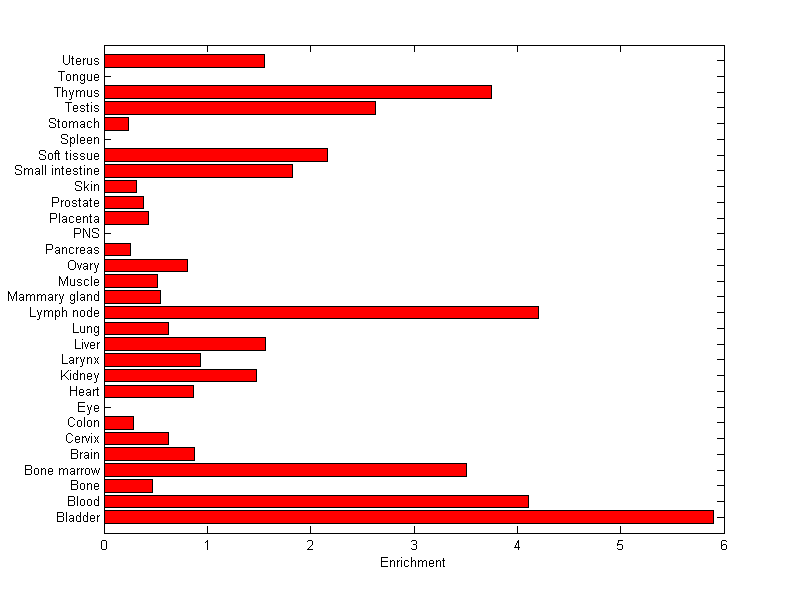 The expression level is normalized with tissue-library size. Each value for a gene in a tissue is a ratio of observed ESTs to the expected one in this tissue. The expected number of ESTs is the product of total ESTs of the gene and the fraction of total ESTs in the tissue among all ESTs in 30 tissues.