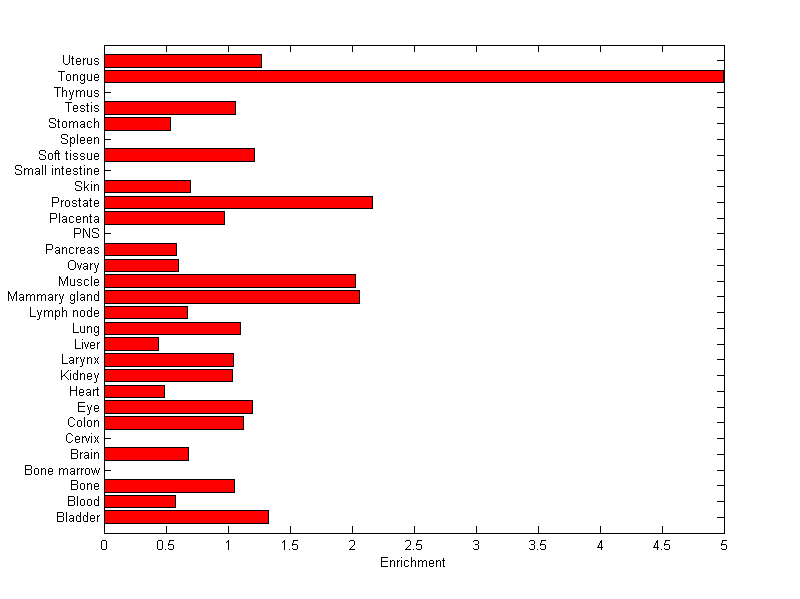 The expression level is normalized with tissue-library size. Each value for a gene in a tissue is a ratio of observed ESTs to the expected one in this tissue. The expected number of ESTs is the product of total ESTs of the gene and the fraction of total ESTs in the tissue among all ESTs in 30 tissues.