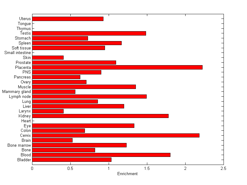 The expression level is normalized with tissue-library size. Each value for a gene in a tissue is a ratio of observed ESTs to the expected one in this tissue. The expected number of ESTs is the product of total ESTs of the gene and the fraction of total ESTs in the tissue among all ESTs in 30 tissues.