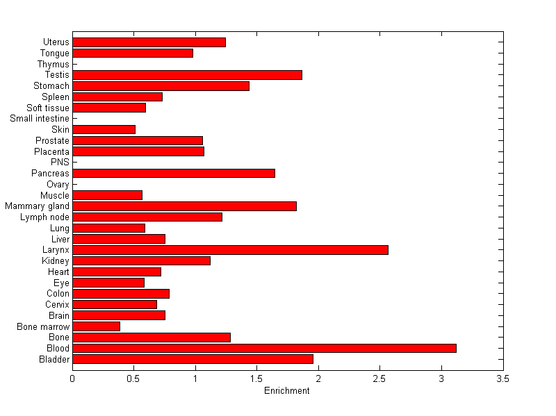 The expression level is normalized with tissue-library size. Each value for a gene in a tissue is a ratio of observed ESTs to the expected one in this tissue. The expected number of ESTs is the product of total ESTs of the gene and the fraction of total ESTs in the tissue among all ESTs in 30 tissues.
