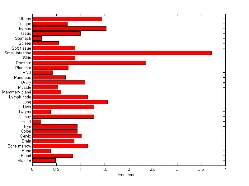 The expression level is normalized with tissue-library size. Each value for a gene in a tissue is a ratio of observed ESTs to the expected one in this tissue. The expected number of ESTs is the product of total ESTs of the gene and the fraction of total ESTs in the tissue among all ESTs in 30 tissues.
