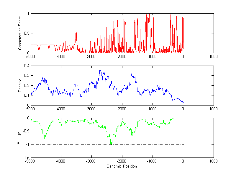The energy profile (green curve) is about energy for module detection based on TF interaction. The positions with energy less than -1 indicate the existence of CRMs.