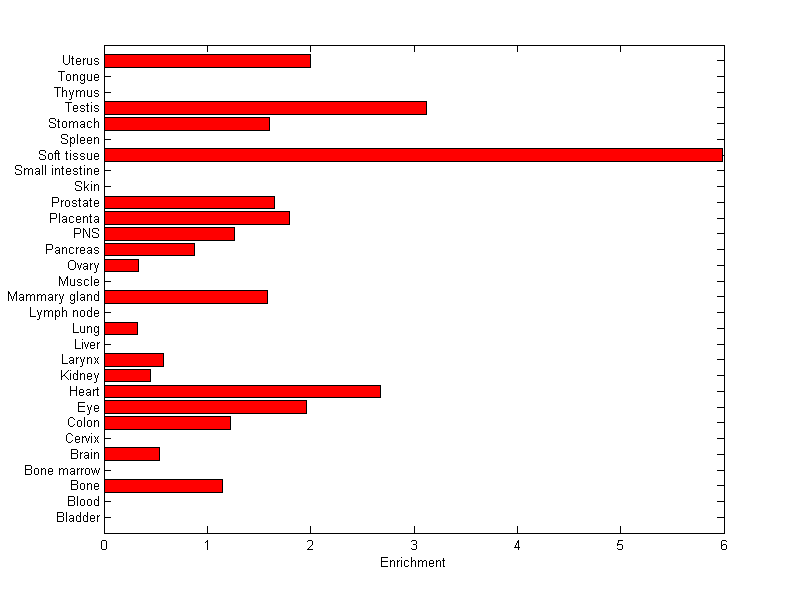 The expression level is normalized with tissue-library size. Each value for a gene in a tissue is a ratio of observed ESTs to the expected one in this tissue. The expected number of ESTs is the product of total ESTs of the gene and the fraction of total ESTs in the tissue among all ESTs in 30 tissues.