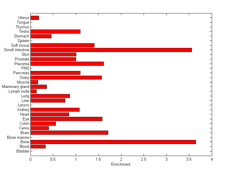The expression level is normalized with tissue-library size. Each value for a gene in a tissue is a ratio of observed ESTs to the expected one in this tissue. The expected number of ESTs is the product of total ESTs of the gene and the fraction of total ESTs in the tissue among all ESTs in 30 tissues.