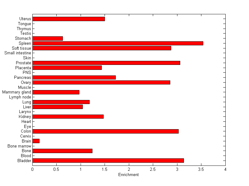 The expression level is normalized with tissue-library size. Each value for a gene in a tissue is a ratio of observed ESTs to the expected one in this tissue. The expected number of ESTs is the product of total ESTs of the gene and the fraction of total ESTs in the tissue among all ESTs in 30 tissues.