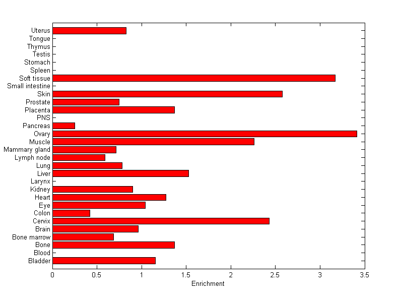 The expression level is normalized with tissue-library size. Each value for a gene in a tissue is a ratio of observed ESTs to the expected one in this tissue. The expected number of ESTs is the product of total ESTs of the gene and the fraction of total ESTs in the tissue among all ESTs in 30 tissues.