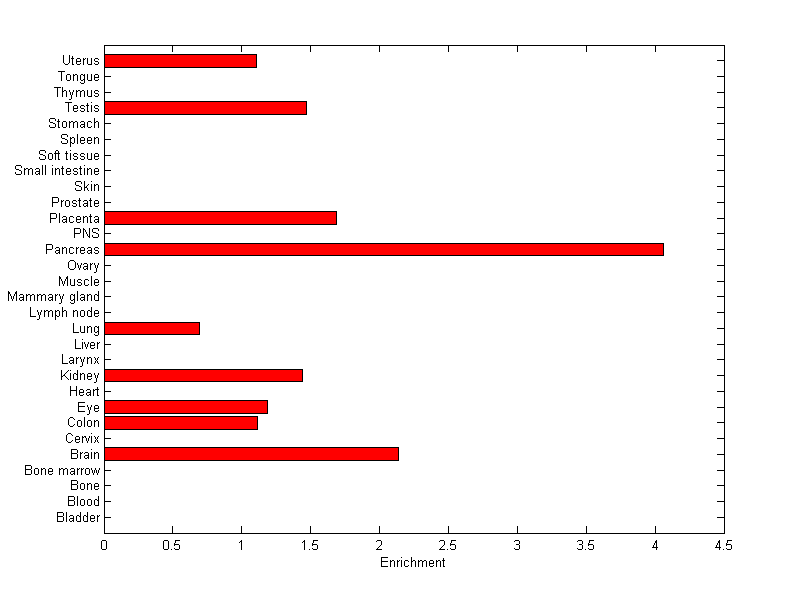 The expression level is normalized with tissue-library size. Each value for a gene in a tissue is a ratio of observed ESTs to the expected one in this tissue. The expected number of ESTs is the product of total ESTs of the gene and the fraction of total ESTs in the tissue among all ESTs in 30 tissues.