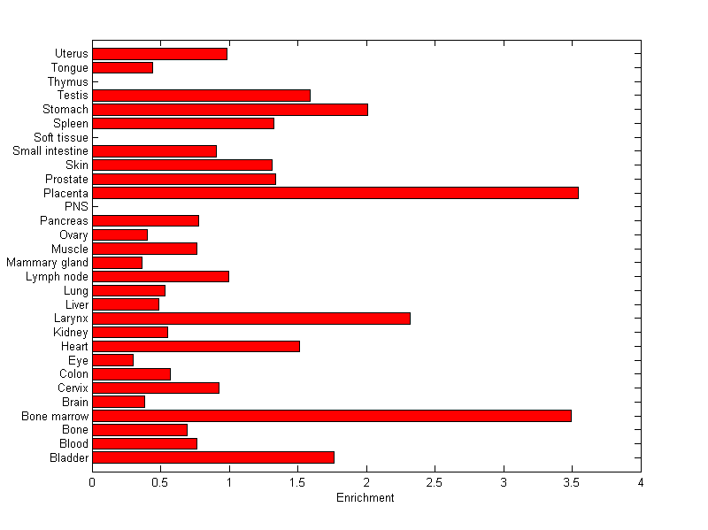 The expression level is normalized with tissue-library size. Each value for a gene in a tissue is a ratio of observed ESTs to the expected one in this tissue. The expected number of ESTs is the product of total ESTs of the gene and the fraction of total ESTs in the tissue among all ESTs in 30 tissues.