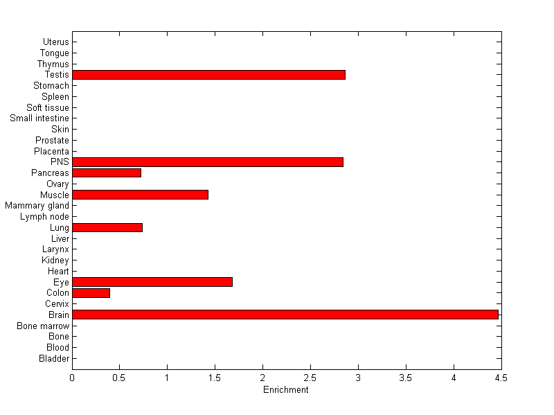 The expression level is normalized with tissue-library size. Each value for a gene in a tissue is a ratio of observed ESTs to the expected one in this tissue. The expected number of ESTs is the product of total ESTs of the gene and the fraction of total ESTs in the tissue among all ESTs in 30 tissues.