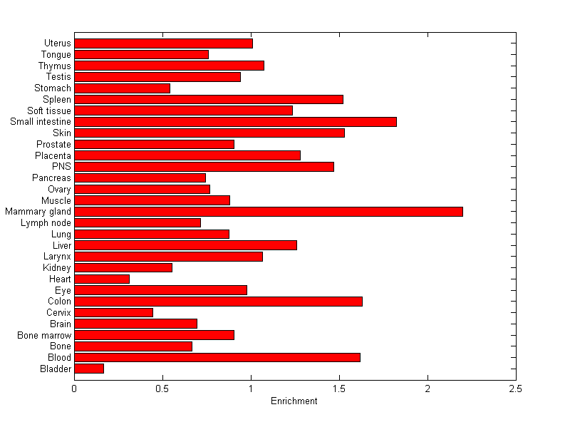 The expression level is normalized with tissue-library size. Each value for a gene in a tissue is a ratio of observed ESTs to the expected one in this tissue. The expected number of ESTs is the product of total ESTs of the gene and the fraction of total ESTs in the tissue among all ESTs in 30 tissues.