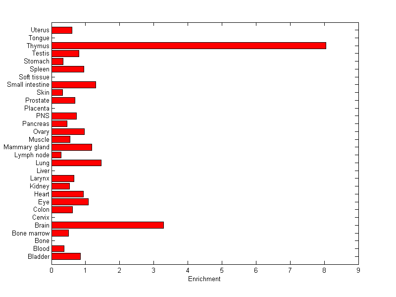 The expression level is normalized with tissue-library size. Each value for a gene in a tissue is a ratio of observed ESTs to the expected one in this tissue. The expected number of ESTs is the product of total ESTs of the gene and the fraction of total ESTs in the tissue among all ESTs in 30 tissues.