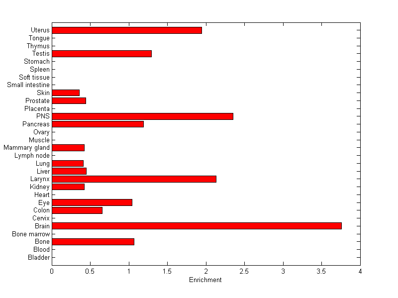 The expression level is normalized with tissue-library size. Each value for a gene in a tissue is a ratio of observed ESTs to the expected one in this tissue. The expected number of ESTs is the product of total ESTs of the gene and the fraction of total ESTs in the tissue among all ESTs in 30 tissues.