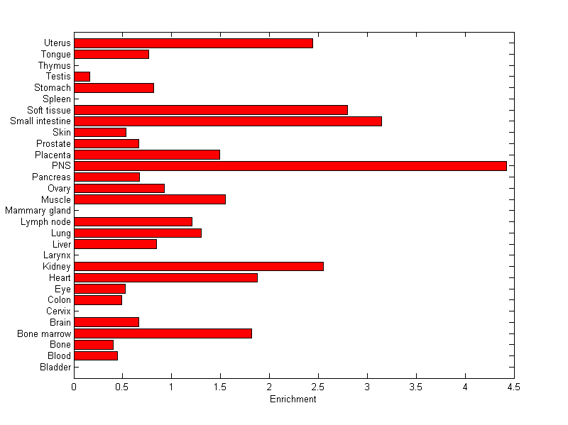 The expression level is normalized with tissue-library size. Each value for a gene in a tissue is a ratio of observed ESTs to the expected one in this tissue. The expected number of ESTs is the product of total ESTs of the gene and the fraction of total ESTs in the tissue among all ESTs in 30 tissues.