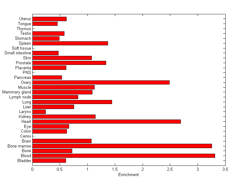 The expression level is normalized with tissue-library size. Each value for a gene in a tissue is a ratio of observed ESTs to the expected one in this tissue. The expected number of ESTs is the product of total ESTs of the gene and the fraction of total ESTs in the tissue among all ESTs in 30 tissues.