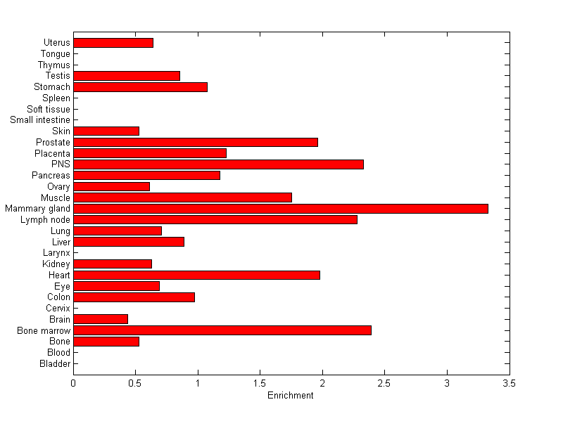 The expression level is normalized with tissue-library size. Each value for a gene in a tissue is a ratio of observed ESTs to the expected one in this tissue. The expected number of ESTs is the product of total ESTs of the gene and the fraction of total ESTs in the tissue among all ESTs in 30 tissues.