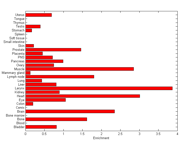 The expression level is normalized with tissue-library size. Each value for a gene in a tissue is a ratio of observed ESTs to the expected one in this tissue. The expected number of ESTs is the product of total ESTs of the gene and the fraction of total ESTs in the tissue among all ESTs in 30 tissues.