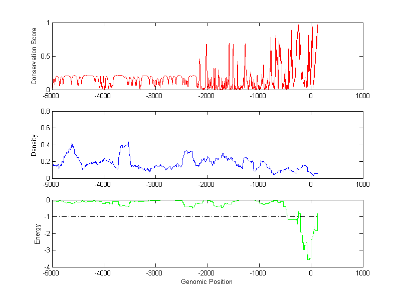 The energy profile (green curve) is about energy for module detection based on TF interaction. The positions with energy less than -1 indicate the existence of CRMs.
