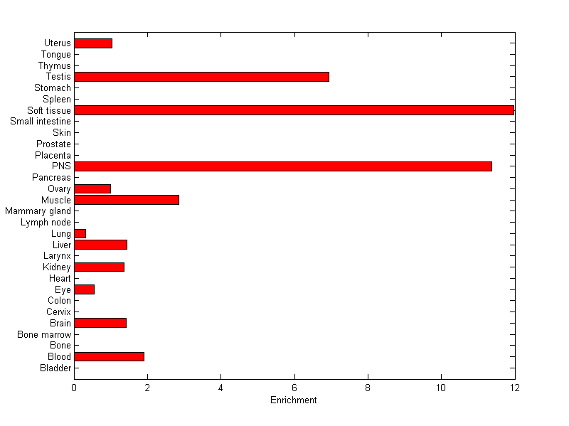 The expression level is normalized with tissue-library size. Each value for a gene in a tissue is a ratio of observed ESTs to the expected one in this tissue. The expected number of ESTs is the product of total ESTs of the gene and the fraction of total ESTs in the tissue among all ESTs in 30 tissues.