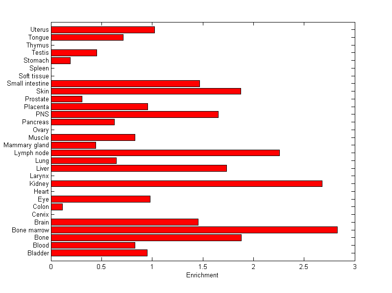 The expression level is normalized with tissue-library size. Each value for a gene in a tissue is a ratio of observed ESTs to the expected one in this tissue. The expected number of ESTs is the product of total ESTs of the gene and the fraction of total ESTs in the tissue among all ESTs in 30 tissues.