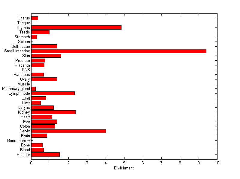 The expression level is normalized with tissue-library size. Each value for a gene in a tissue is a ratio of observed ESTs to the expected one in this tissue. The expected number of ESTs is the product of total ESTs of the gene and the fraction of total ESTs in the tissue among all ESTs in 30 tissues.