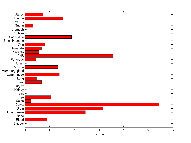 The expression level is normalized with tissue-library size. Each value for a gene in a tissue is a ratio of observed ESTs to the expected one in this tissue. The expected number of ESTs is the product of total ESTs of the gene and the fraction of total ESTs in the tissue among all ESTs in 30 tissues.