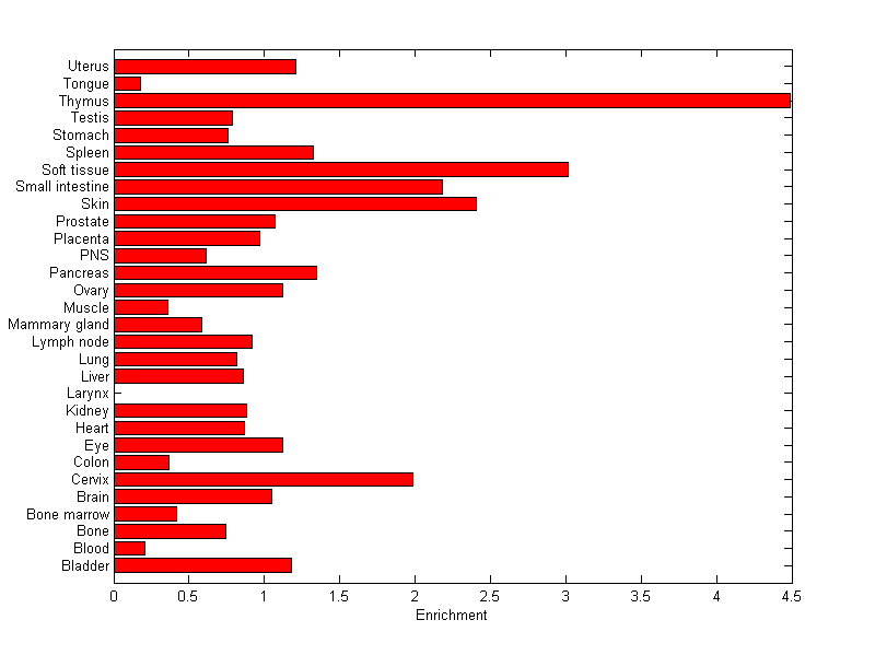 The expression level is normalized with tissue-library size. Each value for a gene in a tissue is a ratio of observed ESTs to the expected one in this tissue. The expected number of ESTs is the product of total ESTs of the gene and the fraction of total ESTs in the tissue among all ESTs in 30 tissues.