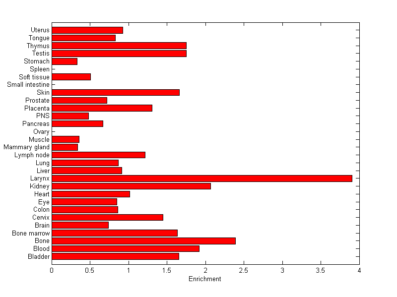 The expression level is normalized with tissue-library size. Each value for a gene in a tissue is a ratio of observed ESTs to the expected one in this tissue. The expected number of ESTs is the product of total ESTs of the gene and the fraction of total ESTs in the tissue among all ESTs in 30 tissues.