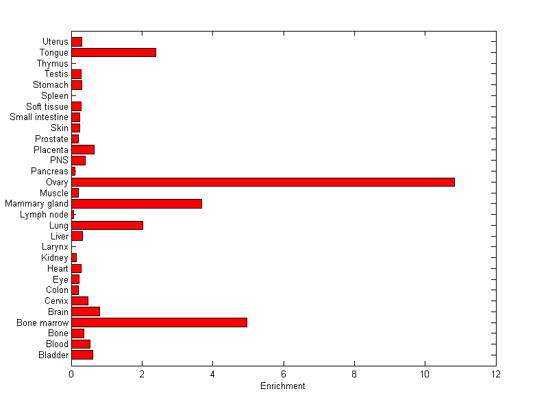 The expression level is normalized with tissue-library size. Each value for a gene in a tissue is a ratio of observed ESTs to the expected one in this tissue. The expected number of ESTs is the product of total ESTs of the gene and the fraction of total ESTs in the tissue among all ESTs in 30 tissues.