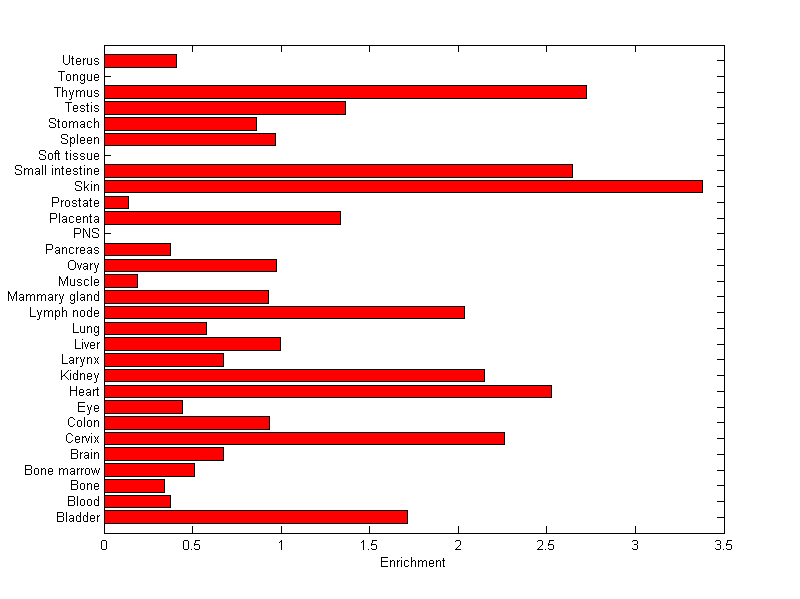 The expression level is normalized with tissue-library size. Each value for a gene in a tissue is a ratio of observed ESTs to the expected one in this tissue. The expected number of ESTs is the product of total ESTs of the gene and the fraction of total ESTs in the tissue among all ESTs in 30 tissues.