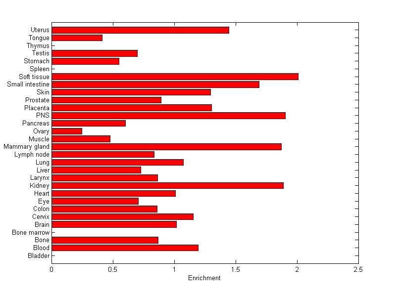 The expression level is normalized with tissue-library size. Each value for a gene in a tissue is a ratio of observed ESTs to the expected one in this tissue. The expected number of ESTs is the product of total ESTs of the gene and the fraction of total ESTs in the tissue among all ESTs in 30 tissues.