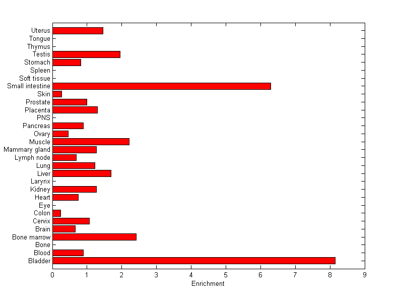 The expression level is normalized with tissue-library size. Each value for a gene in a tissue is a ratio of observed ESTs to the expected one in this tissue. The expected number of ESTs is the product of total ESTs of the gene and the fraction of total ESTs in the tissue among all ESTs in 30 tissues.