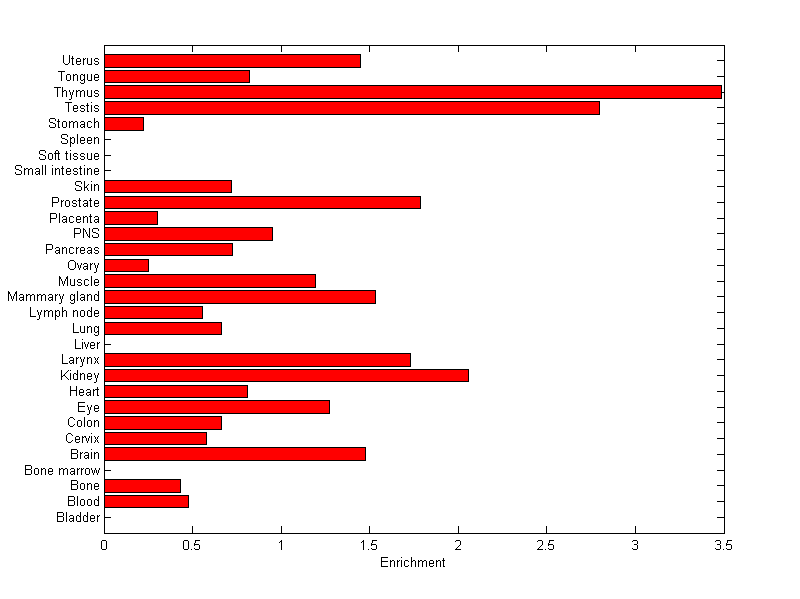 The expression level is normalized with tissue-library size. Each value for a gene in a tissue is a ratio of observed ESTs to the expected one in this tissue. The expected number of ESTs is the product of total ESTs of the gene and the fraction of total ESTs in the tissue among all ESTs in 30 tissues.