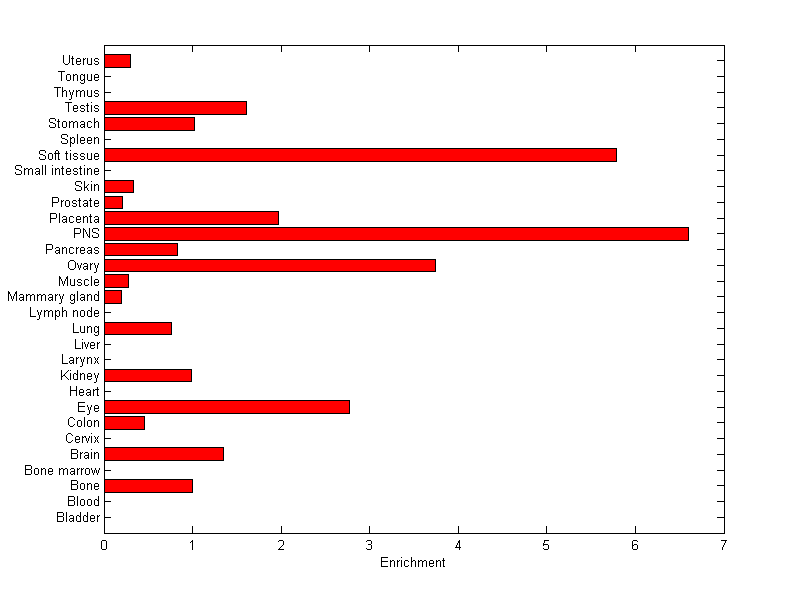 The expression level is normalized with tissue-library size. Each value for a gene in a tissue is a ratio of observed ESTs to the expected one in this tissue. The expected number of ESTs is the product of total ESTs of the gene and the fraction of total ESTs in the tissue among all ESTs in 30 tissues.