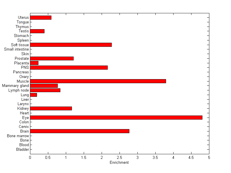 The expression level is normalized with tissue-library size. Each value for a gene in a tissue is a ratio of observed ESTs to the expected one in this tissue. The expected number of ESTs is the product of total ESTs of the gene and the fraction of total ESTs in the tissue among all ESTs in 30 tissues.