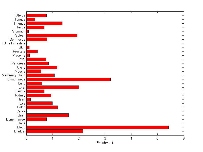 About the profile: The expression level is normalized with tissue-library size. Each value for a gene in a tissue is a ratio of observed ESTs to the expected one in this tissue. The expected number of ESTs is the product of total ESTs of the gene and the fraction of total ESTs in the tissue among all ESTs in 30 tissues. Summary: This gene is preferentially expressed in [blood] Download: |