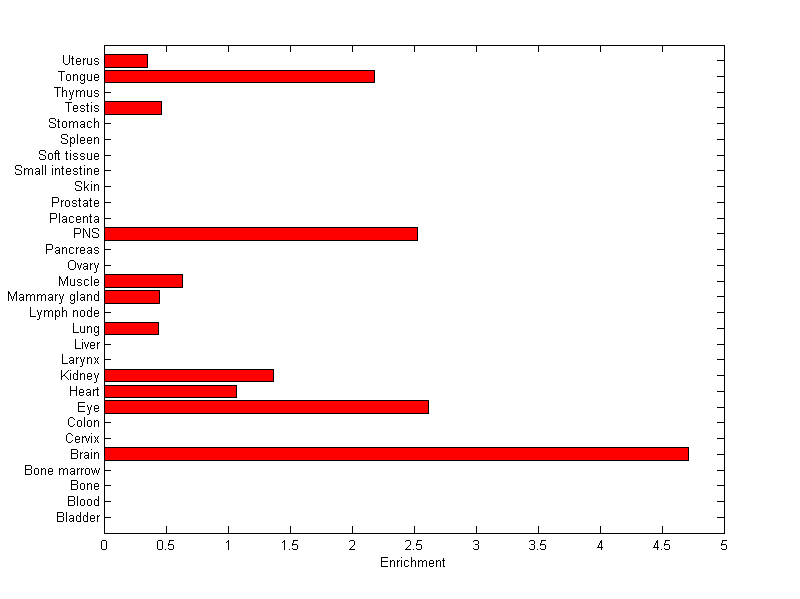 The expression level is normalized with tissue-library size. Each value for a gene in a tissue is a ratio of observed ESTs to the expected one in this tissue. The expected number of ESTs is the product of total ESTs of the gene and the fraction of total ESTs in the tissue among all ESTs in 30 tissues.