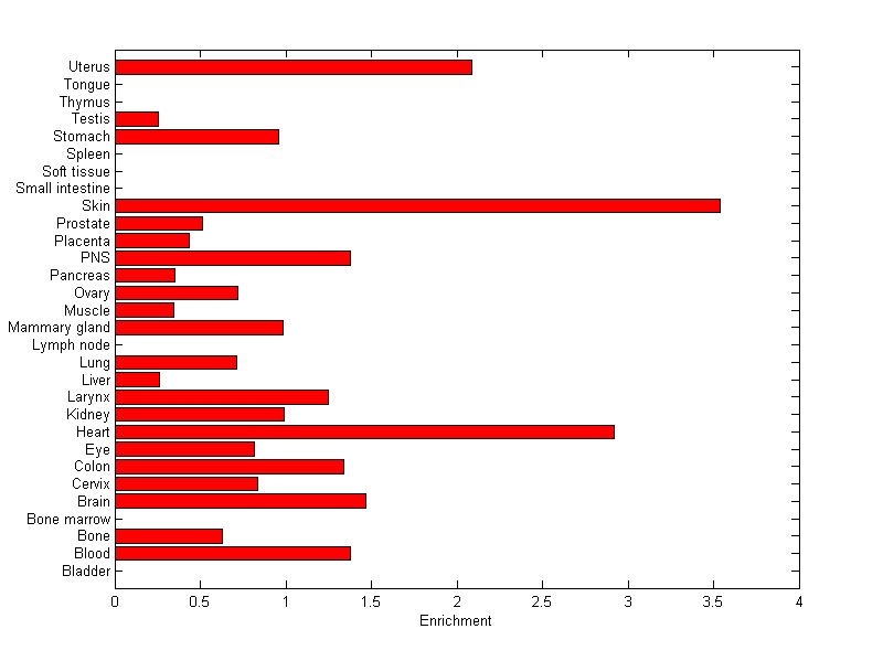 The expression level is normalized with tissue-library size. Each value for a gene in a tissue is a ratio of observed ESTs to the expected one in this tissue. The expected number of ESTs is the product of total ESTs of the gene and the fraction of total ESTs in the tissue among all ESTs in 30 tissues.