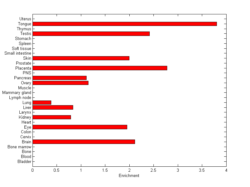 The expression level is normalized with tissue-library size. Each value for a gene in a tissue is a ratio of observed ESTs to the expected one in this tissue. The expected number of ESTs is the product of total ESTs of the gene and the fraction of total ESTs in the tissue among all ESTs in 30 tissues.