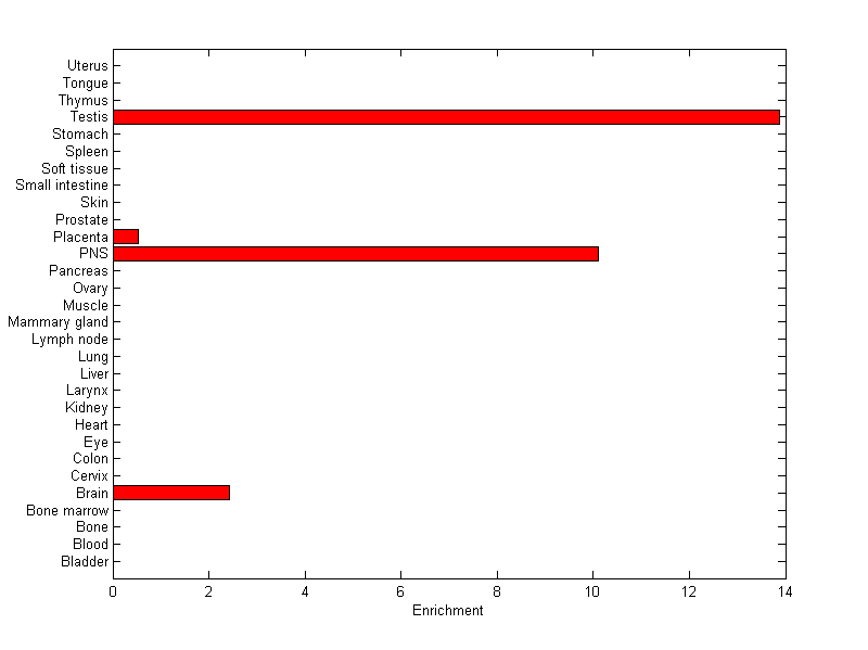 The expression level is normalized with tissue-library size. Each value for a gene in a tissue is a ratio of observed ESTs to the expected one in this tissue. The expected number of ESTs is the product of total ESTs of the gene and the fraction of total ESTs in the tissue among all ESTs in 30 tissues.