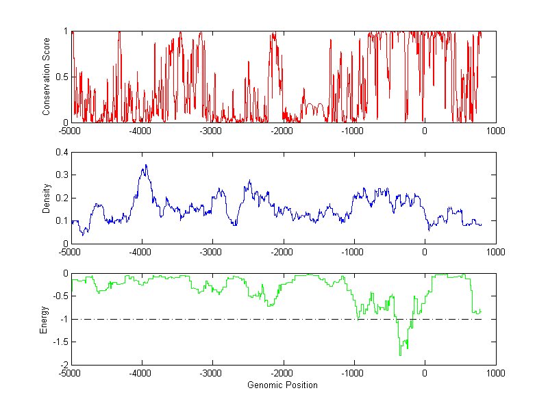 About the profiles: The conservation profile (red curve) is about conservation scores of the promoter sequences. Conservation was determined from an eight-way alignment of human, chimpanzee, dog, mouse, rat, chicken, zebrafish and fugu sequences. The conservation was quantified by a conservation score between 0 and 1, with 1 as highest conservation. The conservation score was obtained from UCSC genome databases. The density profile (blue curve) is about density of all TF binding sites. The energy profile (green curve) is about energy for module detection based on TF interaction. The positions with energy less than -1 indicate the existence of CRMs. Download: Conservation profileDensity profile Energy profile CRM summary |
