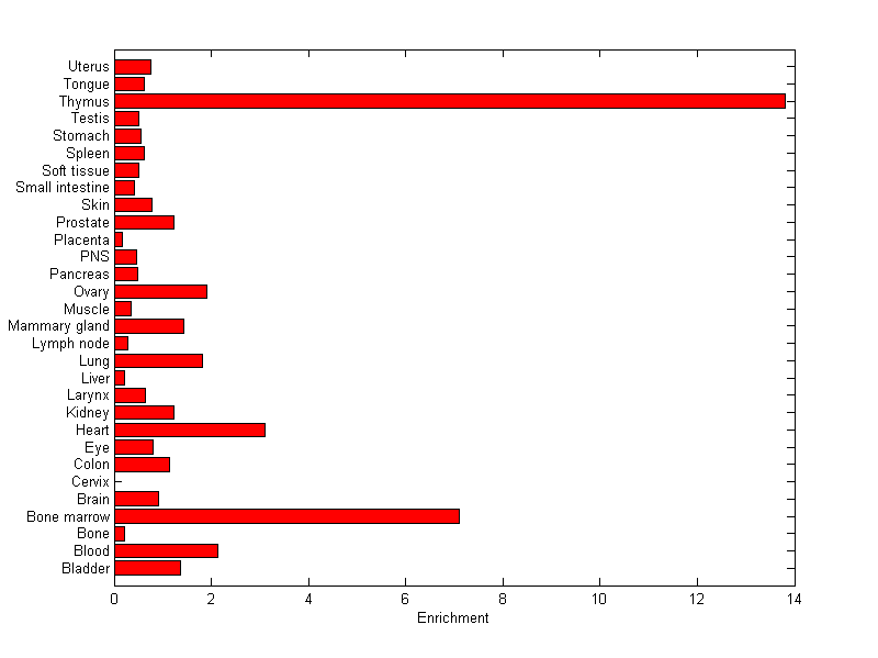 About the profile: The expression level is normalized with tissue-library size. Each value for a gene in a tissue is a ratio of observed ESTs to the expected one in this tissue. The expected number of ESTs is the product of total ESTs of the gene and the fraction of total ESTs in the tissue among all ESTs in 30 tissues. Summary: This gene is preferentially expressed in [bone_marrow, thymus] Download: |