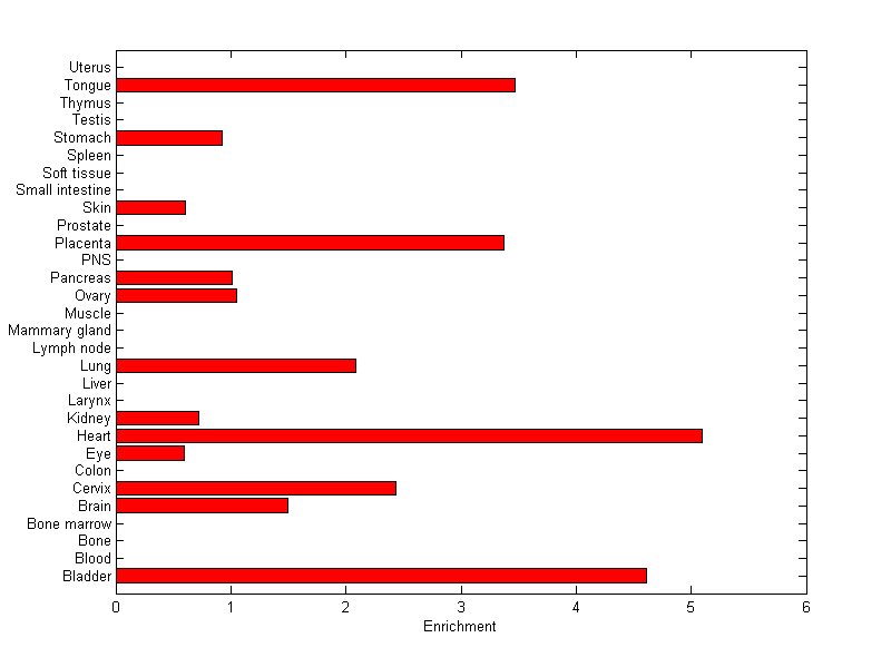 The expression level is normalized with tissue-library size. Each value for a gene in a tissue is a ratio of observed ESTs to the expected one in this tissue. The expected number of ESTs is the product of total ESTs of the gene and the fraction of total ESTs in the tissue among all ESTs in 30 tissues.
